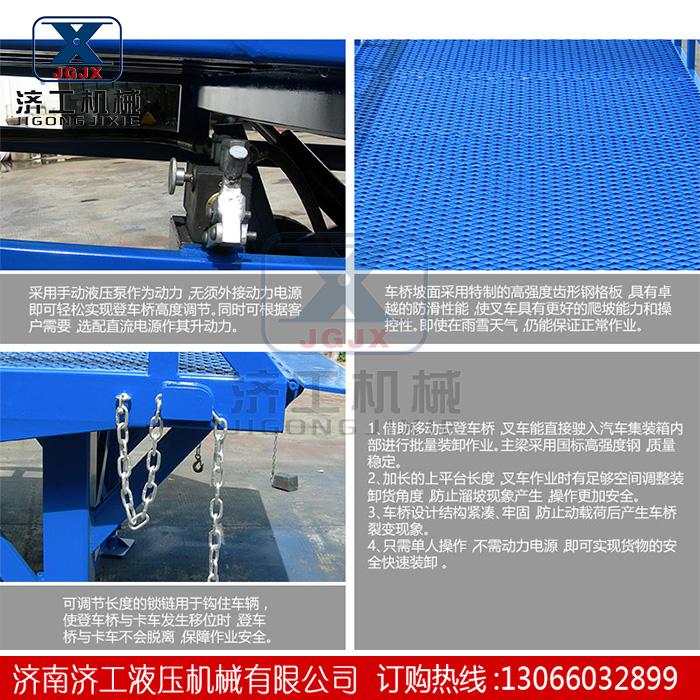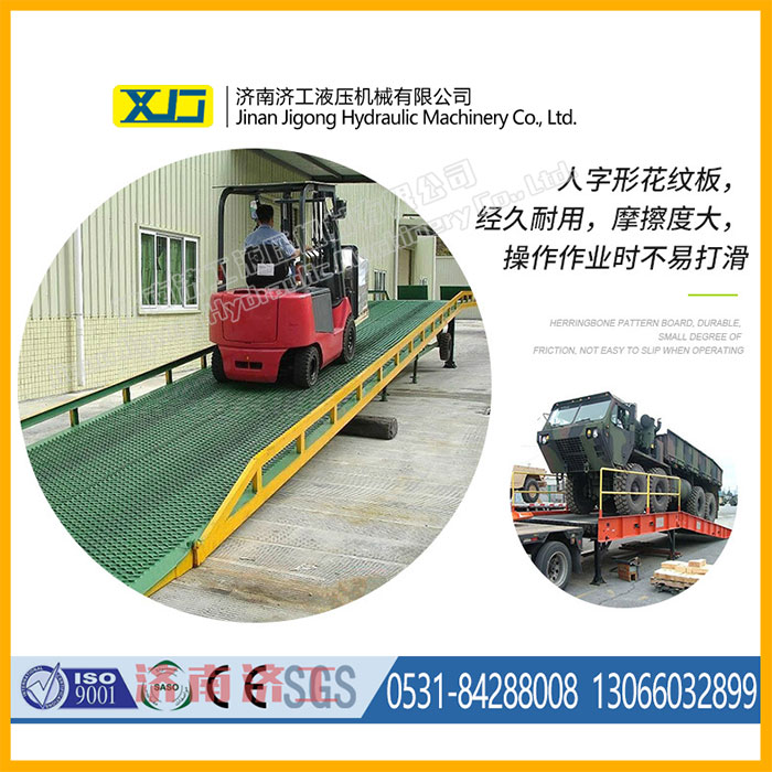 產品規格:根據承載能力產品分為:6、8、10噸液壓登車橋,移動式液壓登車橋是叉車配合使用的貨物裝卸輔助設備,可根據汽車車廂的高低調節高度,叉車可以直接通過本設備駛入車廂內部批量作業,設備采用手動液壓方式無需外接電源,省時省力,提高工作效率。