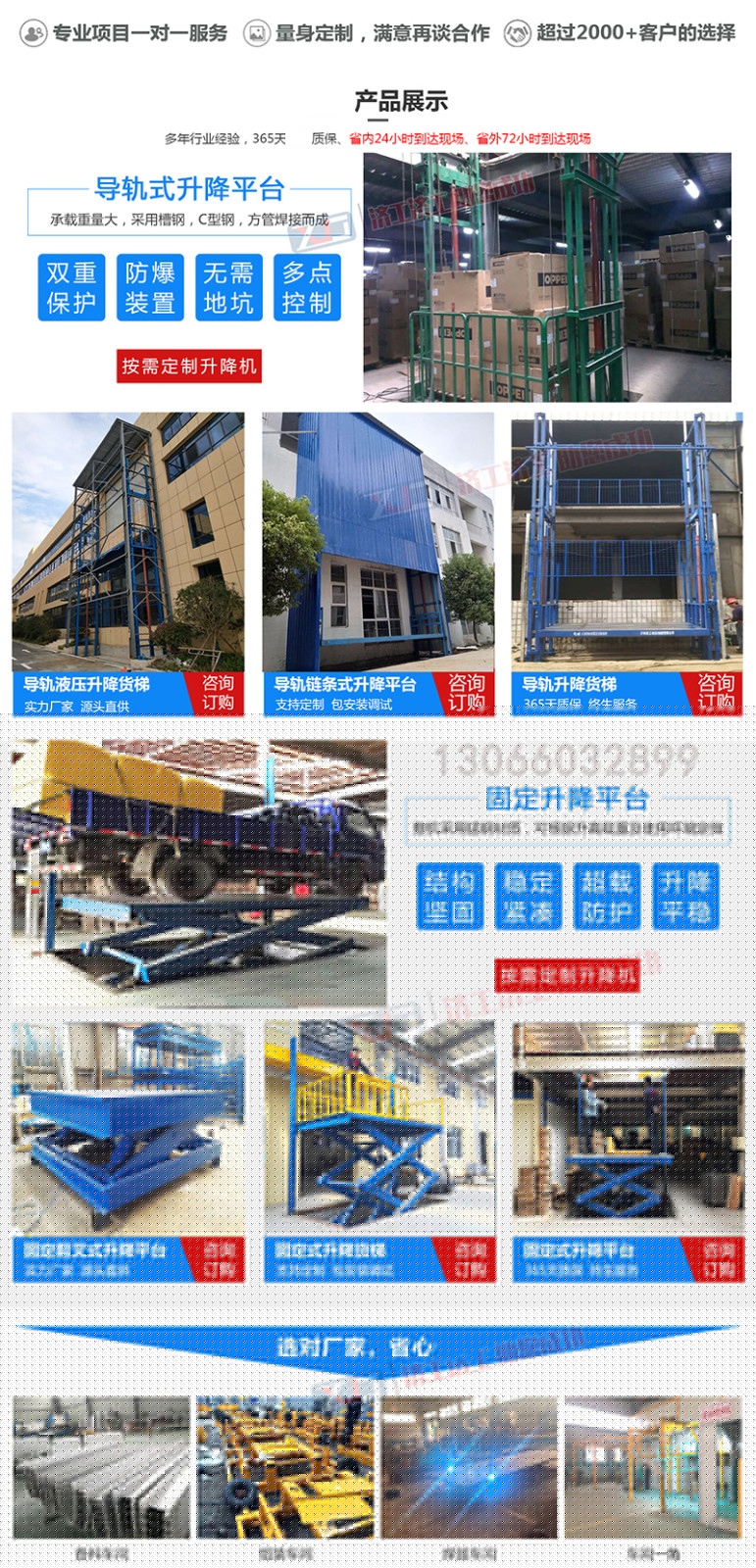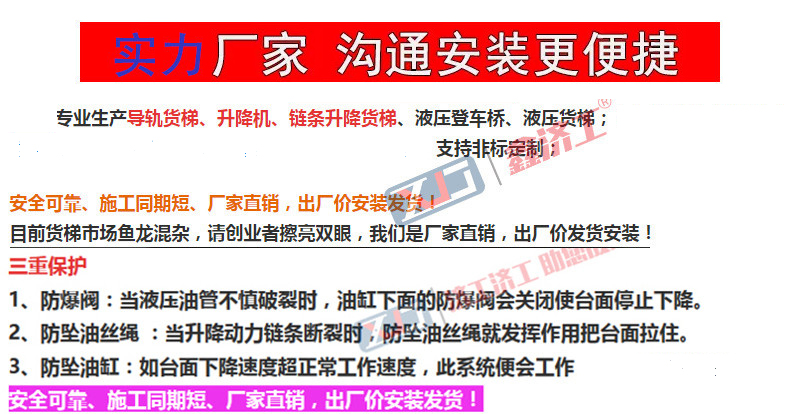 濟工牌升降電梯產品特點:固定式導軌升降機平臺是用于高空作業的專用設備,用途廣泛。該設備具有導軌結構,鏈條傳動,液壓舉升,工作面大,承重能力強,整機穩定性高,適合兩用作業。該設備適用于無法挖坑的工作場所。它具有單崩潰和雙崩潰。該機運轉平穩,安全可靠,適用于超市,醫院,飯店,車間等行業的貨物輸送。此外,正確選擇設備的各種配置可以大限度地利用升降平臺的功能,并達到使用效果。該產品的主要旋轉部件采用耐磨的復合軸套和滾針軸承,可減少支撐桿和支撐桿銷之間的磨損,從而延長設備的使用壽命。使用液壓升降機時,應保持工作表面水平。此外,該產品還廣泛用于工業和采礦企業,以代替電梯來提升貨物。具有結構簡單,承載能力大,使用壽命長,維修方便,安全實用等特點,特適用于不能用豎井在地下挖基礎的場所。該設備的廣泛應用,不僅使高空作業的范圍更廣,而且大大提高了作業效率。它是工廠和企業倉庫物流以及貨物起重中的起重設備。